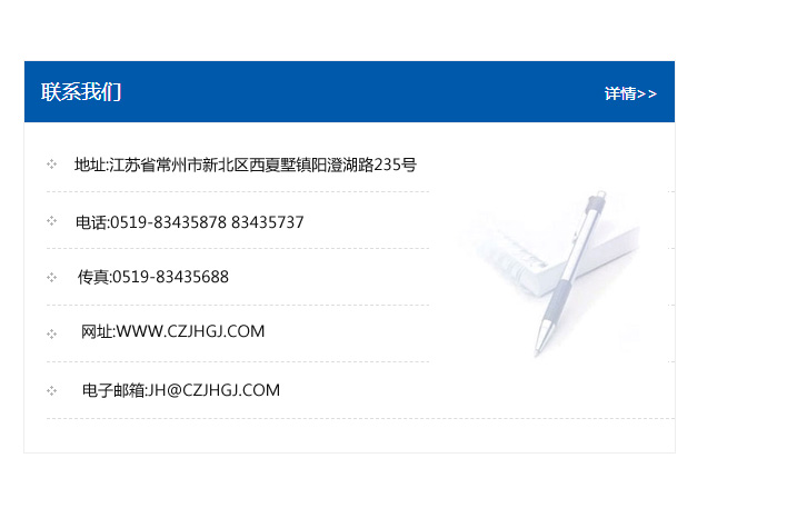 地址:常州市新北區友邦商務大廈1幢16、17層  電話:0519-85101652  傳真:0519-85112595  郵編:213022  網址:www_cz-jiayue_cn.zzgcjx.com  郵箱:xiajifengaa@163.com